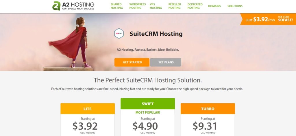 A2hosting SuiteCRM Web Hosting is one that’s in demand right now. A2hosting boasts high efficient Turbo servers through which page loads 20x faster when compared with other web hosting providers.