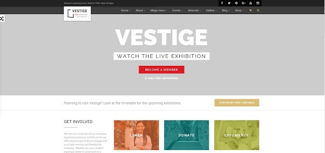 Vestige MuseumVestige Museum is one of the best, clean, elegant and responsive wordpress theme for Museum, you can create the Best Museum websites. It is a Multipurpose theme and you can use this theme for creating Museums, Events, Charity or Non Profit websites. Event Manager Feature is inbuilt with Vestige Museum WordPress template where you can create Future Events, Recurring events etc